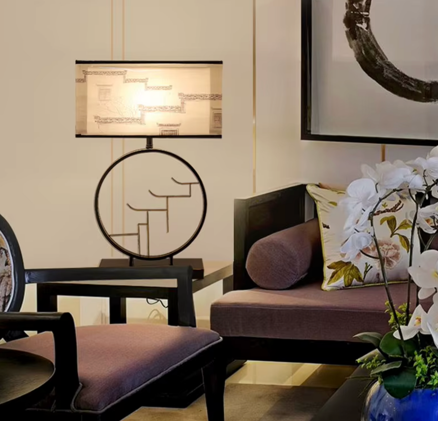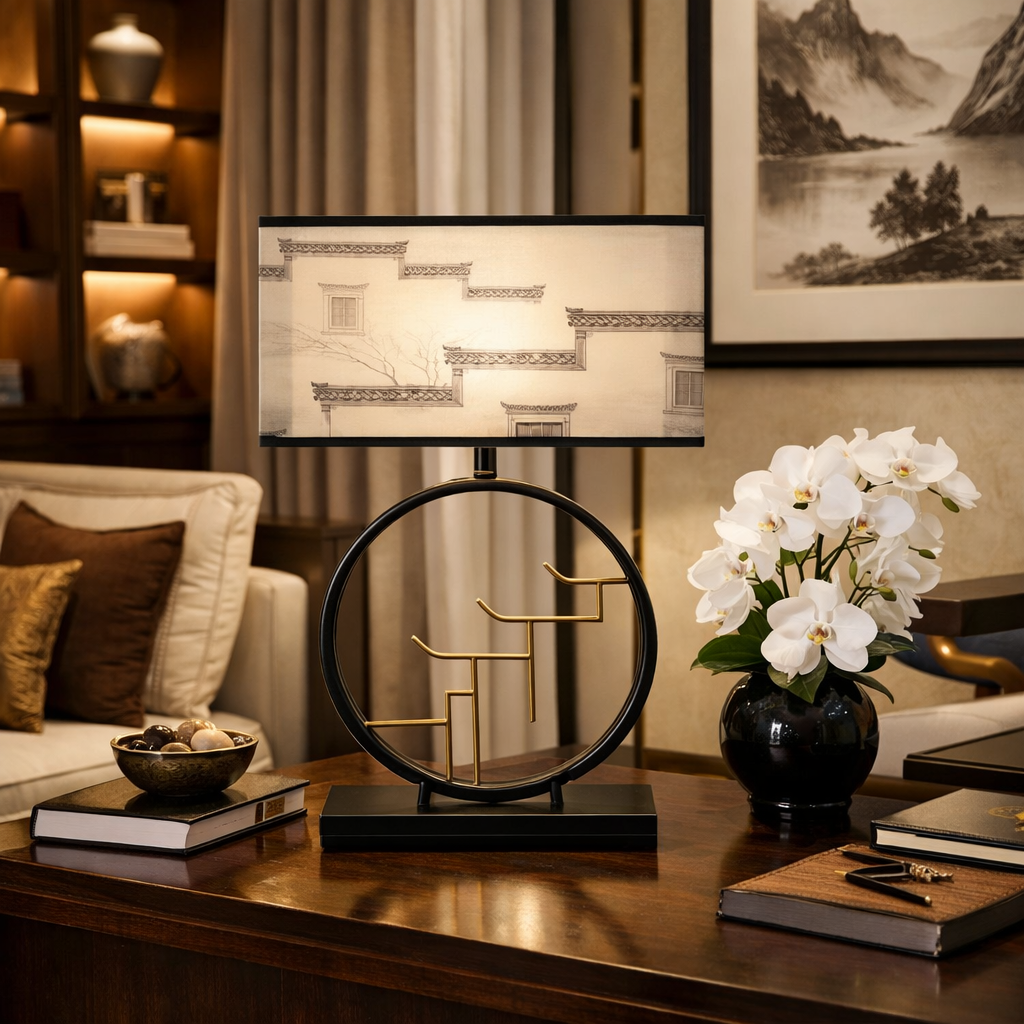 La Lampe de Table Escalier d’Asie redéfinit le luminaire d'appoint avec une silhouette d'une sérénité absolue. Alliant une structure circulaire en fer forgé noir mat à un abat-jour en tissu orné de motifs architecturaux traditionnels, elle apporte une touche de luxe zen et de caractère à votre intérieur. Ce luminaire n'est pas qu'une simple source de lumière ; c'est une pièce de décoration "Nouveau Style Chinois" qui souligne l'esthétique de votre chambre ou de votre salle à thé avec une présence poétique dès qu'elle s'illumine.