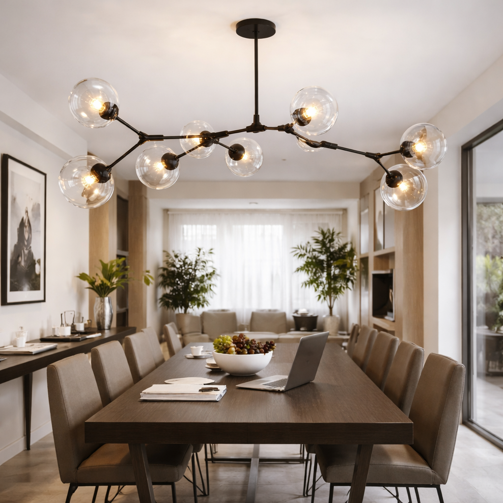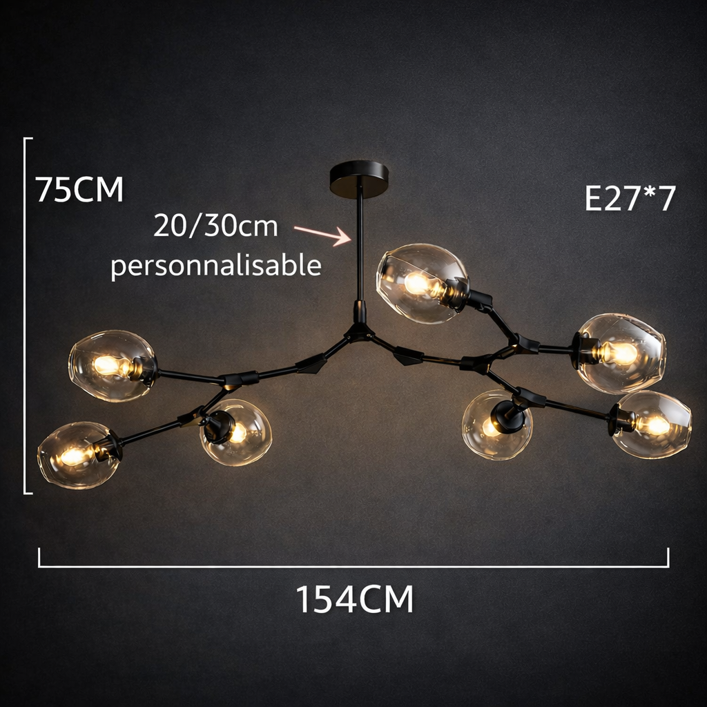 Ce luminaire se distingue par la qualité exceptionnelle de ses matériaux et sa polyvalence technique. La structure en fer bénéficie d'un traitement de surface par anodisation pour prévenir toute érosion ou rayure, garantissant une esthétique impeccable sur le long terme. Ses globes en verre de haute qualité offrent une résistance thermique élevée et une transmission lumineuse optimale pour un éclairage doux et enveloppant. Grâce à ses multiples configurations allant de 5 à 10 têtes, le modèle Nébula s'adapte avec précision à vos besoins, offrant une couverture lumineuse stable et sophistiquée pour les intérieurs les plus exigeants.