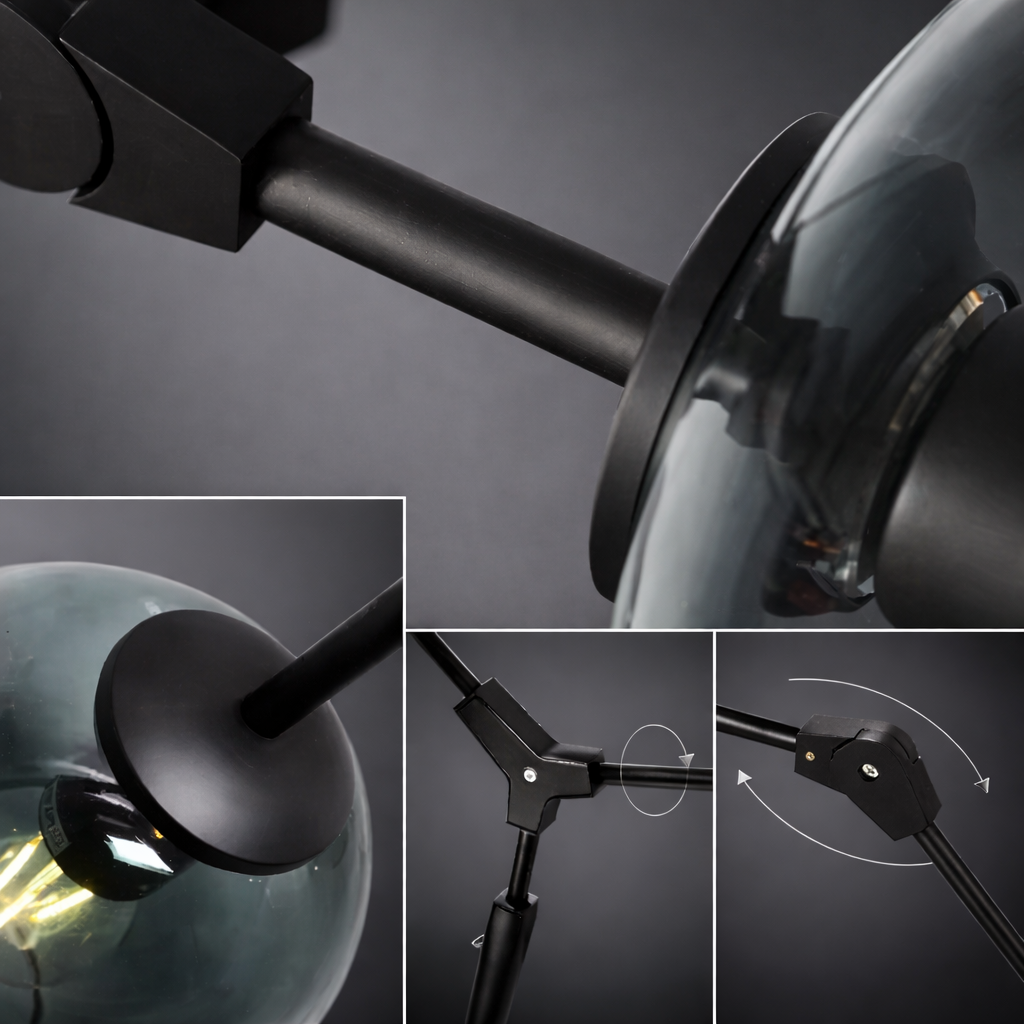 Design "Constellation" moderne : une structure en bras articulés avec globes en verre pour une esthétique spatiale unique.
