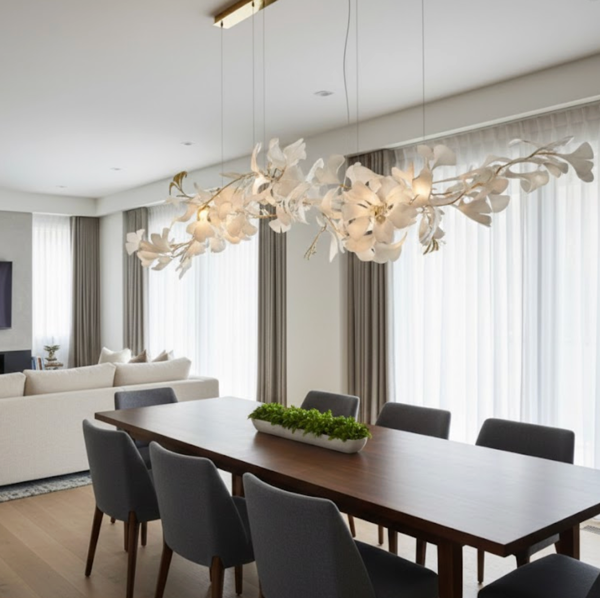 Lustre au design “branche” associant une structure en métal cuivré et des éléments en verre soufflé en forme de fleurs. Il diffuse une lumière douce, adaptée aux espaces de vie comme un salon, une salle à manger, une chambre, un bureau ou une cuisine. Fil réglable (100 cm) et socle individuel inclus. Douille E27 (ampoule incluse ou remplaçable selon version), alimentation 90–260 V.