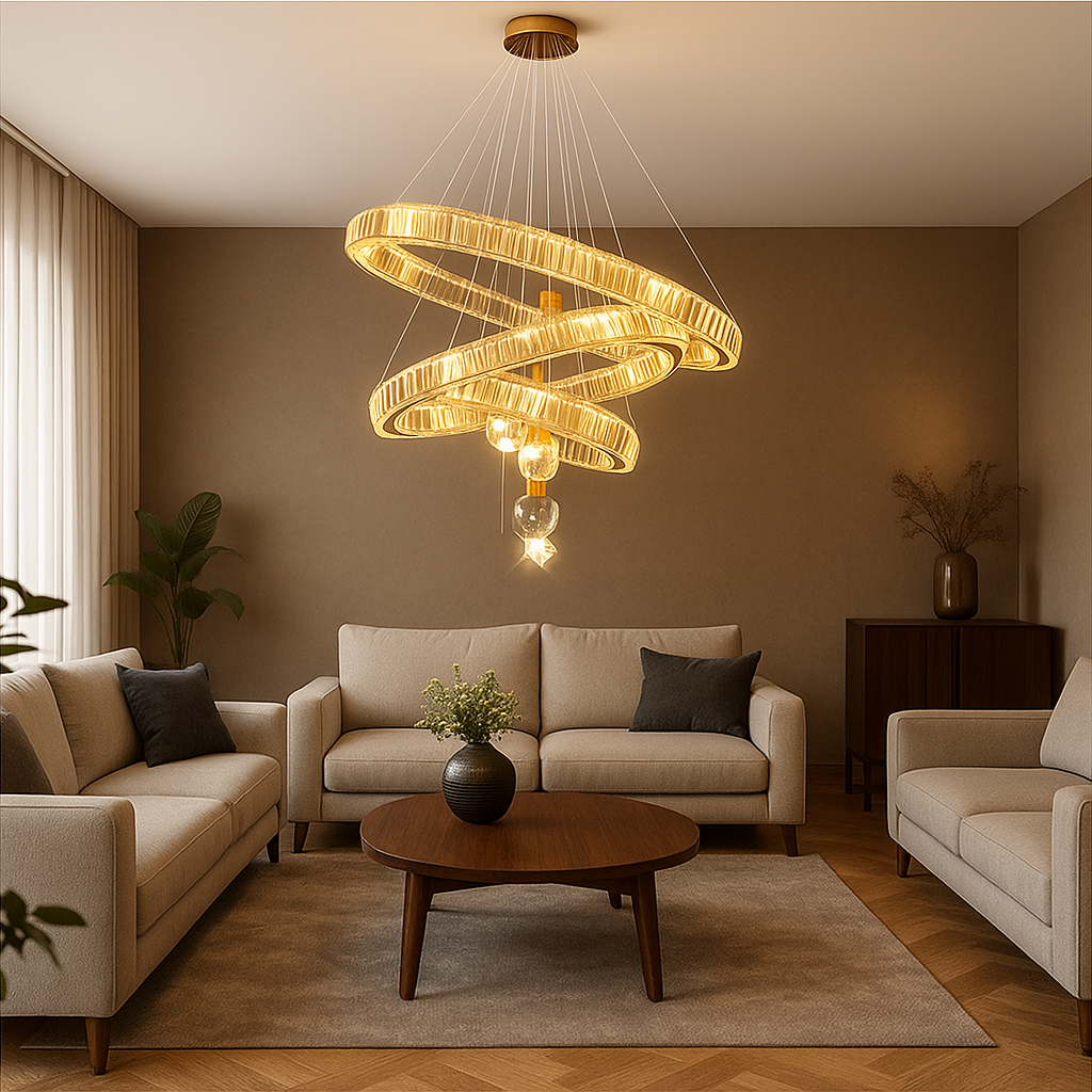 DEMANDER UN DEVISLa Suspension Élancée – Finition Premium est un luminaire sculptural mêlant anneaux dorés entrelacés et cristaux taillés à la main. Son design moderne et architectural en fait une pièce maîtresse idéale pour un salon luxueux, une salle à manger élégante ou un hall d’entrée haut de gamme. Grâce à son éclairage LED intégré et à sa suspension réglable, elle apporte une lumière douce, prestigieuse et parfaitement harmonieuse.